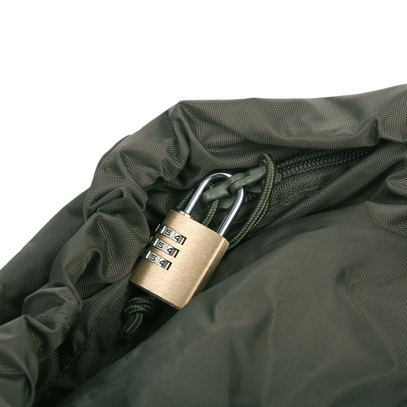 Ihren Rucksack oder Seesack in die Hülle und verschließen Sie sie mit dem Reißverschluss und der Kordel, damit Ihr Gepäck sauber und unbeschädigt bleibt. Sie können den Reißverschluss auch mit einem Vorhängeschloss sichern.