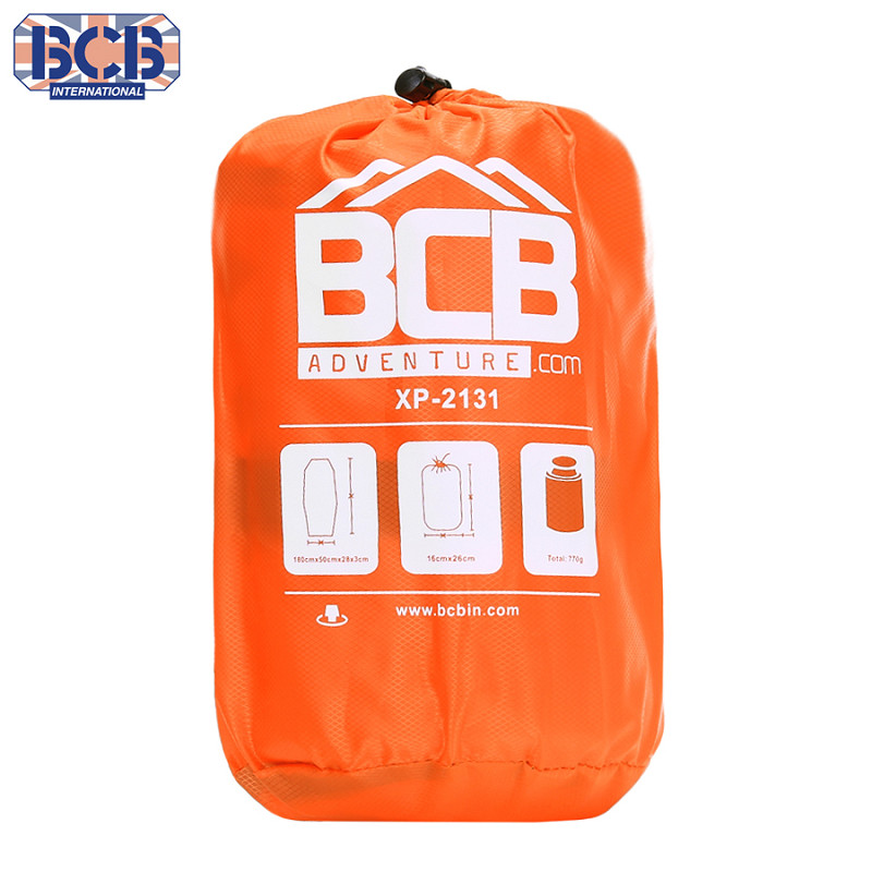 With its 770 grams, the BCB sleeping mat is lightweight and compact to carry. It comes with a storage bag with drawstring. Unrolled and inflated, the mat has a length of 180 cm, and is 50 cm wide at the widest part, 28 cm wide at the foot end and has a thickness of 3 cm.