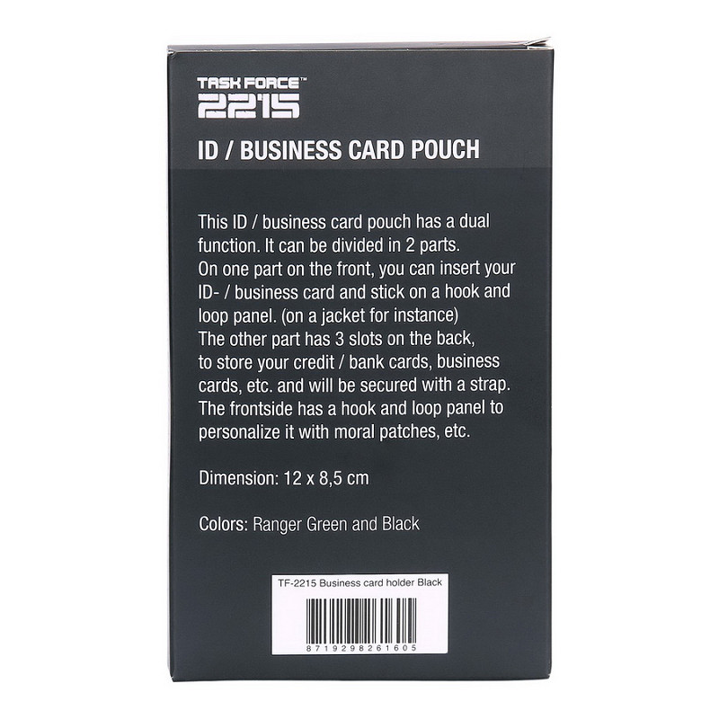 This Business Card holder has a dual function. On one side you can insert your business/name card and stick on a hook and loop panel.