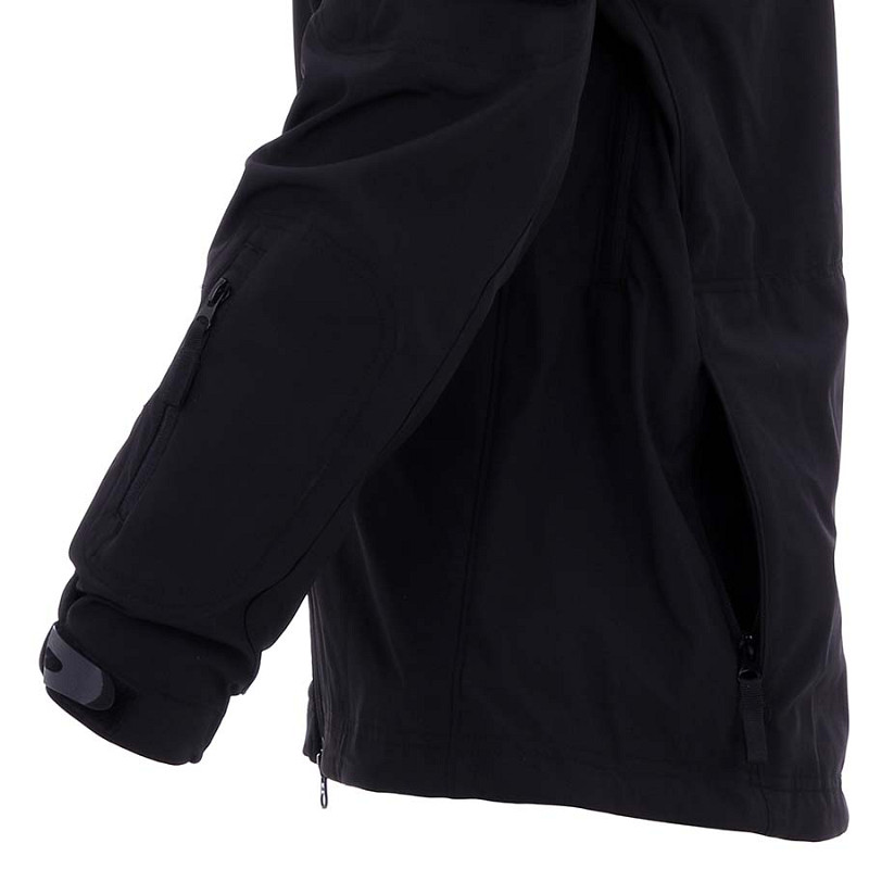 Abrigo Softshell con capucha en el collar alto, bolsillos con cremallera y parches velcro.