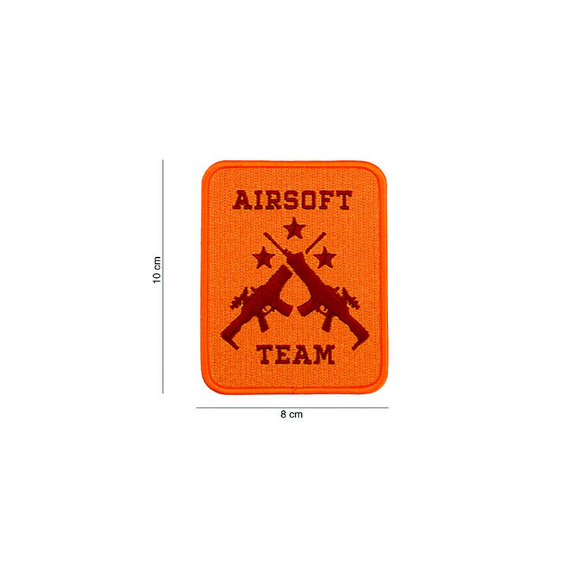 Écusson orange en tissu avec le texte "Airsoft Team" à repasser.
