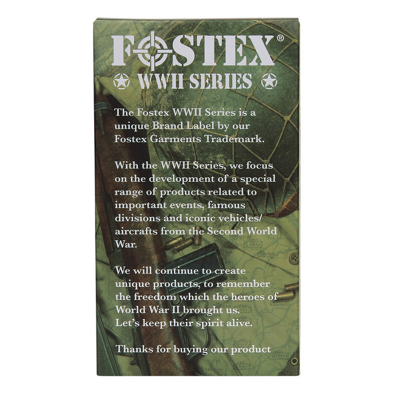 La serie Fostex WWII è un marchio unico sotto il marchio Fostex. Con la serie WWII, ci concentriamo sullo sviluppo di una gamma speciale di prodotti legati a eventi importanti, divisioni famose e veicoli ben noti / aeri della seconda guerra mondiale. Pensate alla famosa 101esima e 82esima divisione aviotrasportata, alla stella americana alleata che si trova su tutti i veicoli dell'esercito americano, e a importanti operazioni come D-Day Overlord, Market Garden ecc.