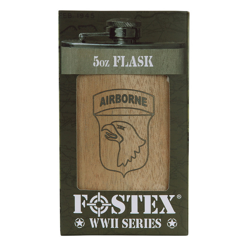 Zakfles 5 ounce met opdruk van de 101st Airborne Eagle. Gemaakt van 100% RVS met een hout-look eromheen.