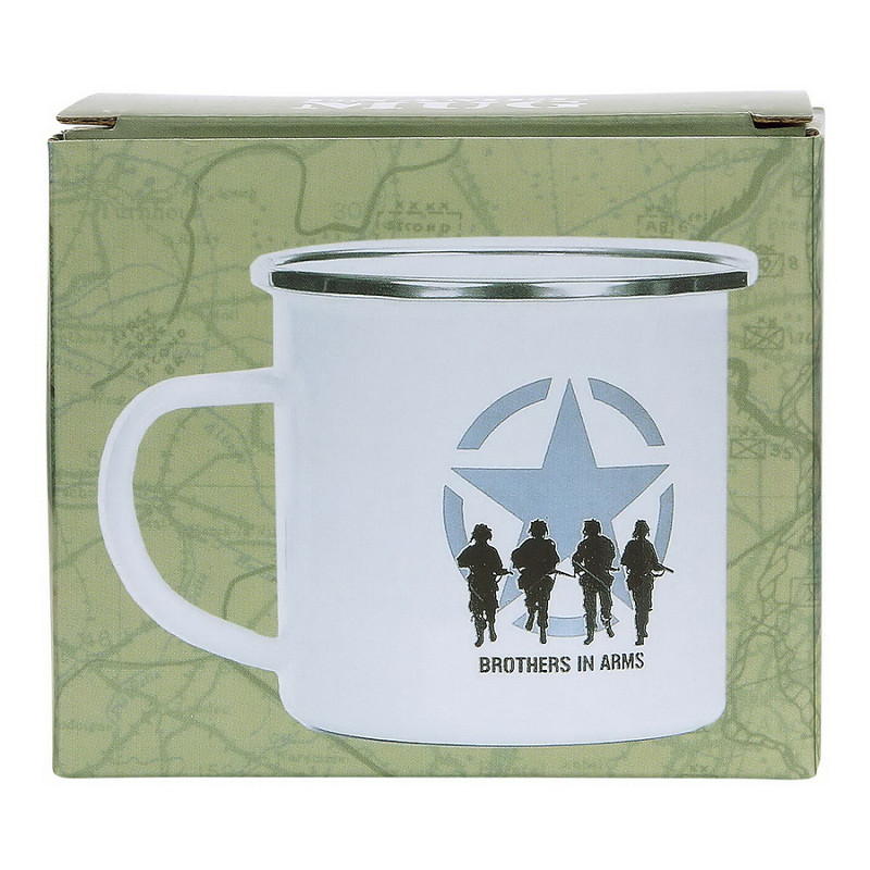 Emaille mok met Brothers in Arms print. De mok is gemaakt van 100% emaille.