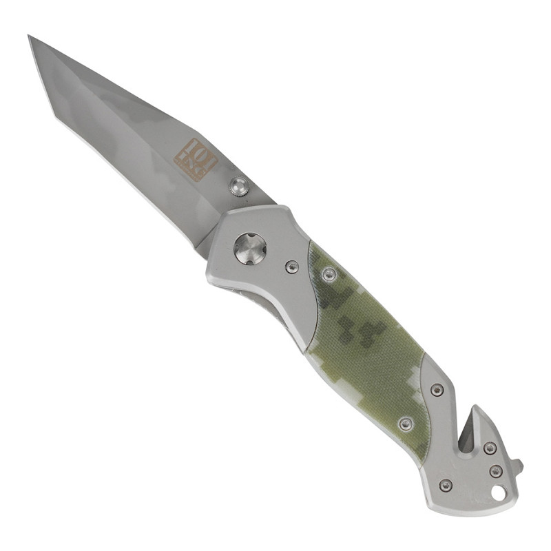 W dolnej części znajduje się łamacz szkła i przecinak do pasów bezpieczeństwa. Nóż otwiera się płynnie za pomocą podpórki pod kciuk, a blokada linerlock zapewnia bezpieczne zamknięcie podczas użytkowania.